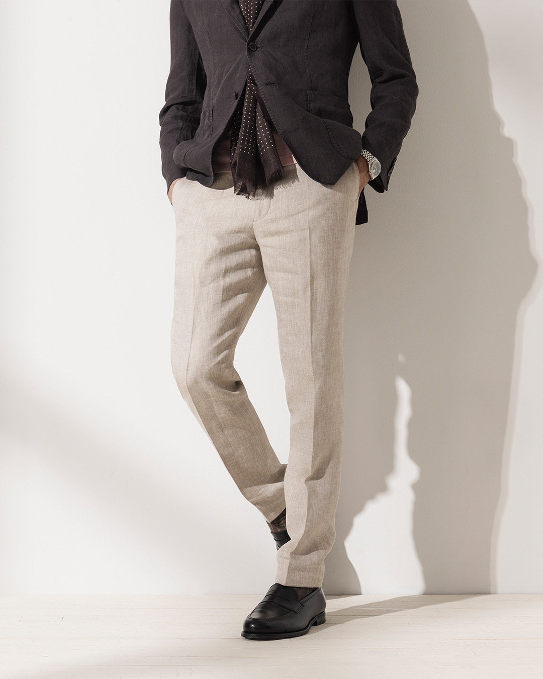 Mikäli loafereissasi on ohuempi pohja ja ovat tummemman sävyiset, saavat ne hieman muodollisemman ilmeen. Nämä sopivat hyvin ohuemmasta kankaasta ommeltujen housujen kanssa ja ovat täydellinen yhdistelmä hyvin leikatun puvun kanssa.