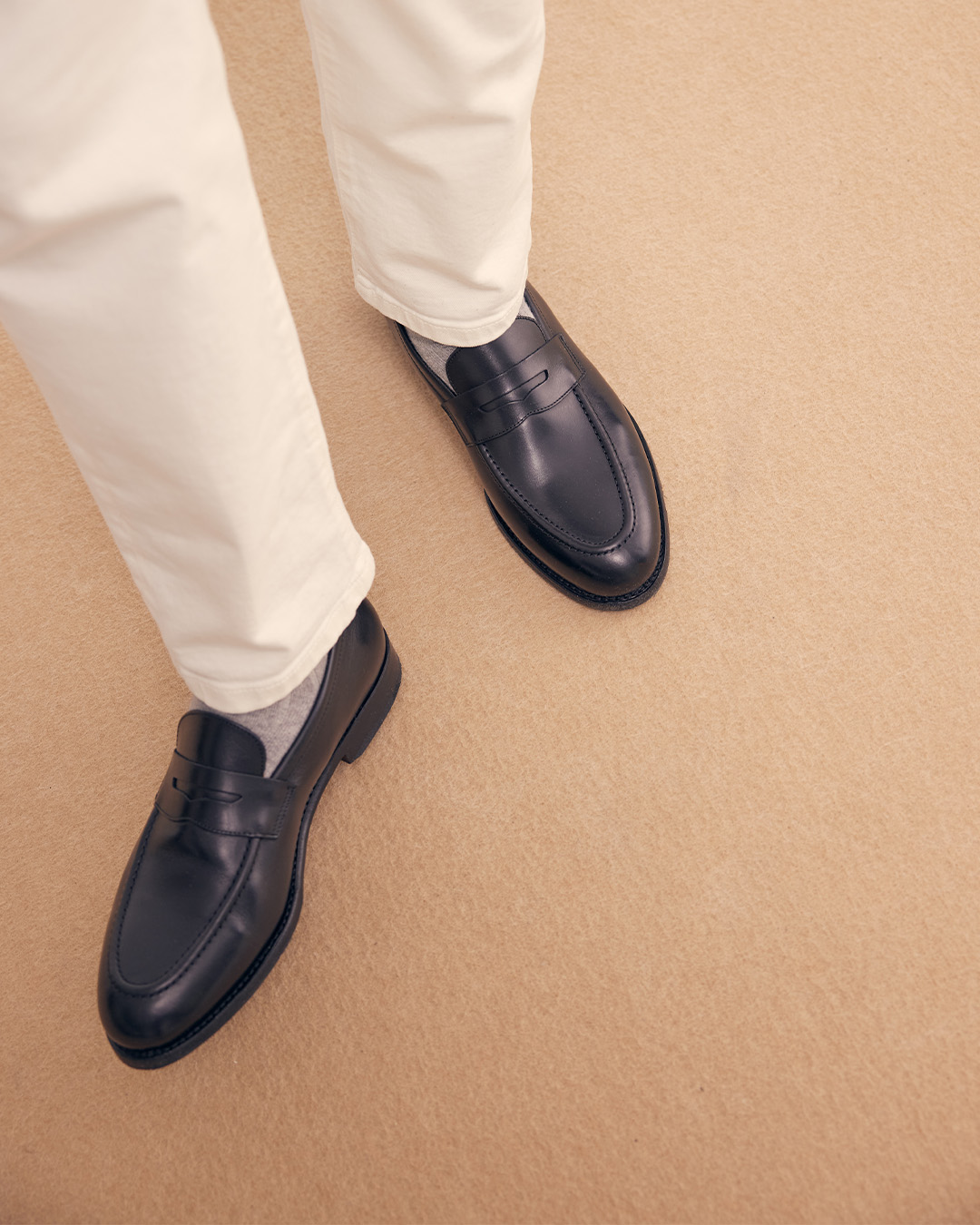 Mustat loaferit: Mustat loaferit tummanharmaiden ja tummansinisten sukkien kanssa sopivat hyvin yhteen harmaiden ja sinisten flanellihousujen kanssa. Yhdistämällä siniset farkut valkoisiin sukkiin voidaan asulle luoda klassinen ilme. Vaaleanharmaat sukat ovat hyvä vaihtoehto vaaleiden chinojen kaveriksi.