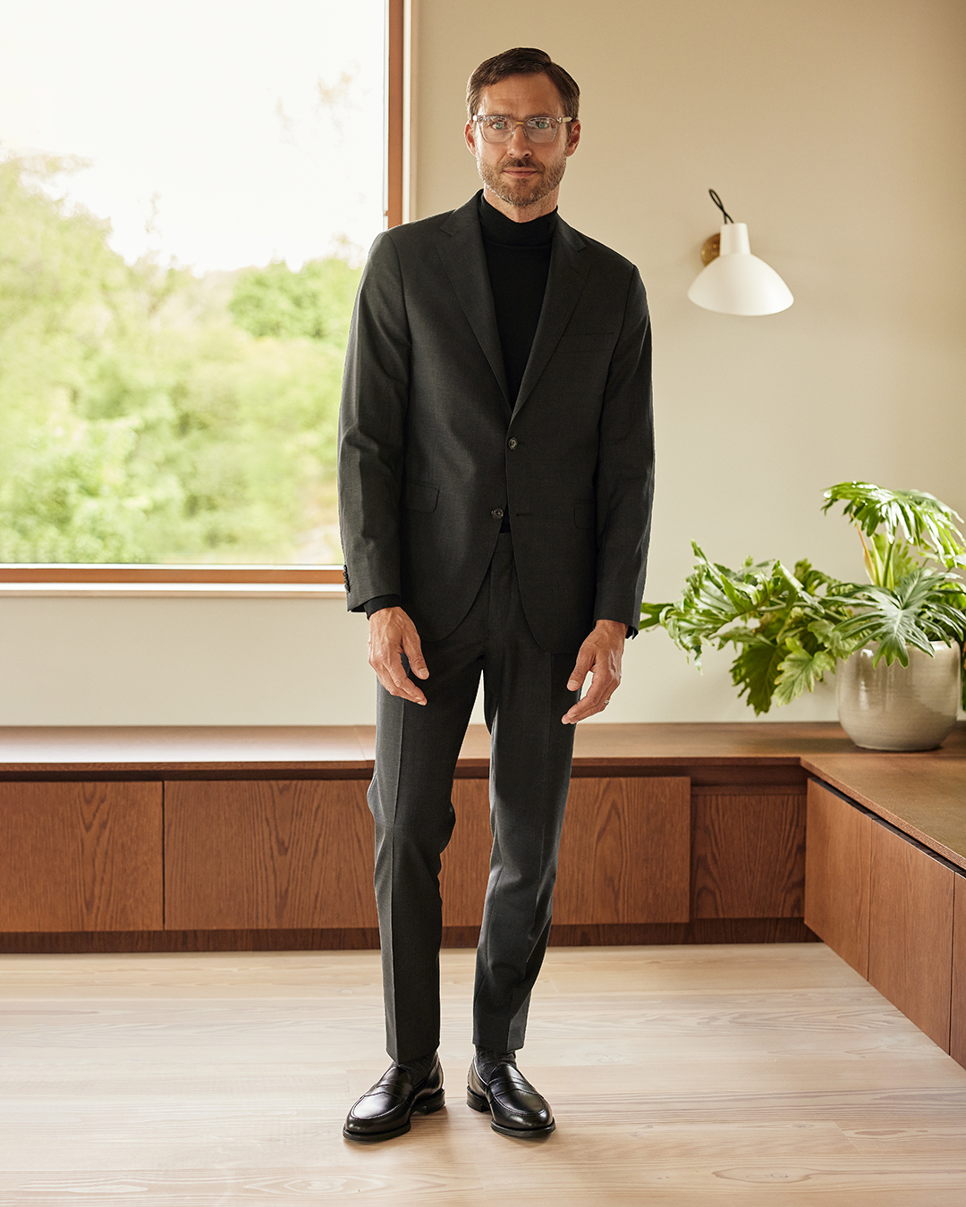 A minimalist, dark grey suit from Oscar Jacobson forms the strong foundation of this look. With this turtleneck from Lanvin, a more relaxed feeling is created compared to a business shirt. The soft virgin wool, cashmere and silk provide an extra exclusive feel. Pair these with Loake 1880 Black Calf Leather Stripe Loafers, handcrafted in England. This elegant style offers both the confidence you need, as well as retaining a professional style. Replace the turtleneck with a white or light blue shirt with or without a tie depending on your style.