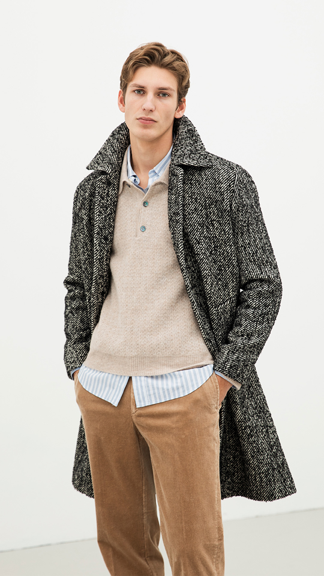 With this wool coat from the Italian producer Manteco, you’ll make a stylish and bold impression. We pair it with retro-inspired pieces, like corduroy trousers in a straight silhouette and classic heeled Chelsea boots, for a classic British "corduroy look." The details add an extra bold touch, here in the form of a belt with a prominent silver buckle.