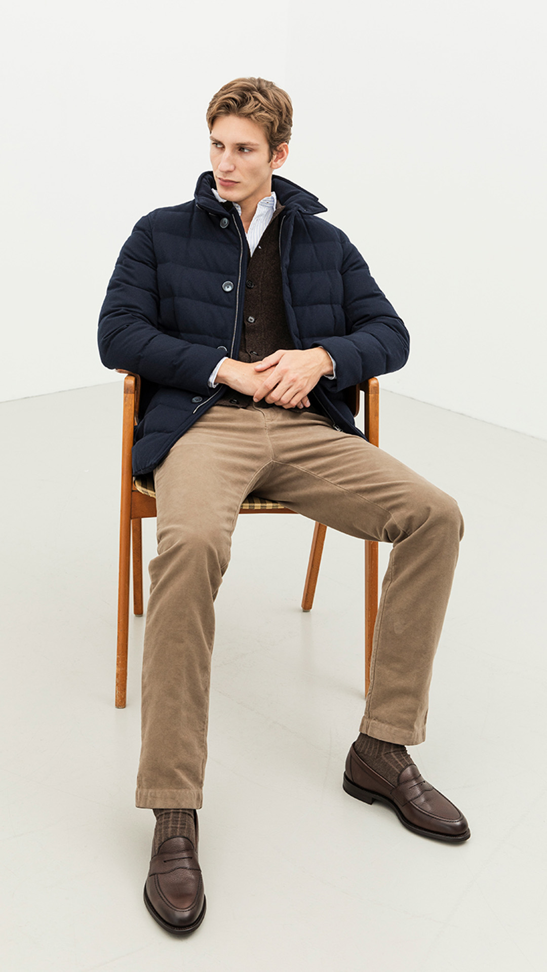 Herno is regarded by many as perhaps Italy's leading outerwear manufacturer. This elegant yet technical jacket is a perfect choice whether you're in our Nordic climate or in an environment where a warm and water-repellent jacket is a must. The combination of wool and down creates a luxurious feel while keeping you warm. In this combination, we focus heavily on layering, with garments like a wool sweater in a harmonious brown tone underneath the jacket. The colours blue and brown create a classic balance, while the black Chelsea boots add a stylish touch.