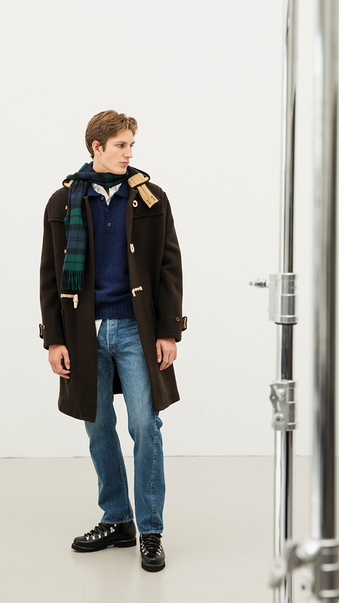 We continue with a classic British theme featuring a timeless garment that has been around since World War II. This green duffle coat is the perfect jacket for autumn and winter, combining style and warmth while offering a vintage feel, inspired by the university look of the 1960s. Paired with sturdy hiking boots, this winter’s must-have footwear, and some knitted accessories, you’ll be ready for the stormy autumn ahead.